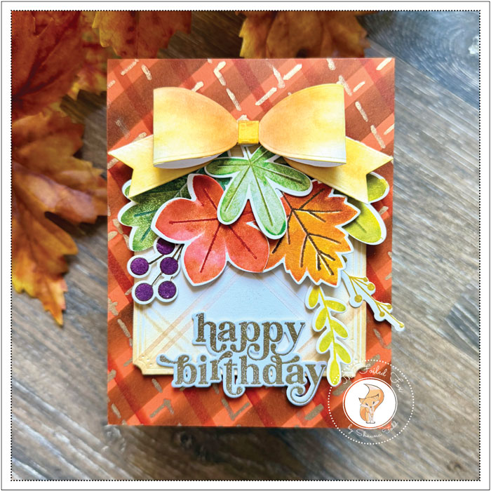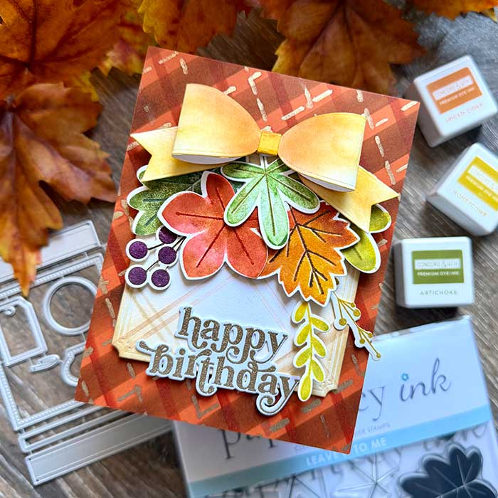 I am sharing a delightful birthday card for those Autumn birthdays. This one was made for a dear friend who not only has a birthday in October but also LOVES Fall colors. For me, I loved making the leaves from the Leave It To Me stamp and die set by Papertrey Ink, and adding the sweet dimensional bow was icing on the cake!