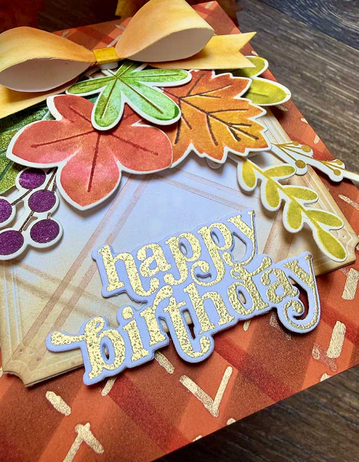 This card all started with the thought of creating a present within the card and making it an Autumnal design. With that in mind, I wanted to create the ‘present’ with a bounty of leaves and a beautiful bow.