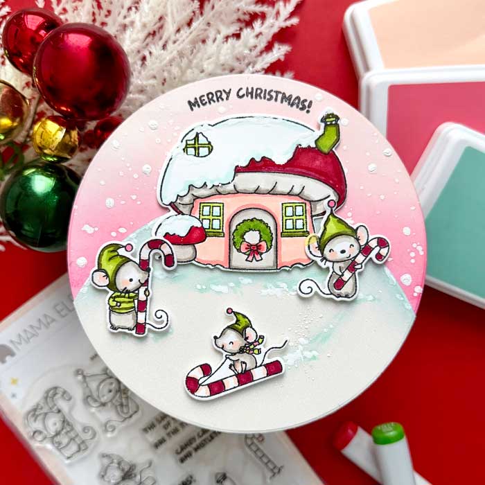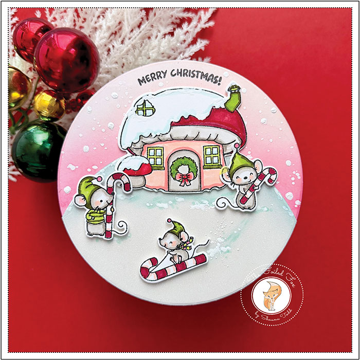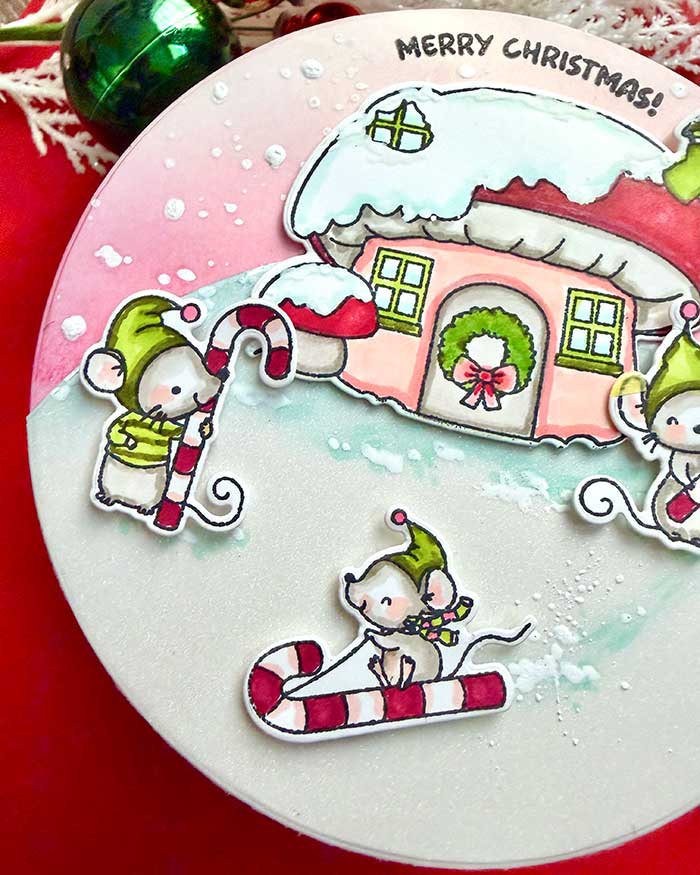 I had a blast making this card in the round and creating a snowy, mice-loving scene. I haven’t colored little critters in a while, and I had forgotten how fun it is!