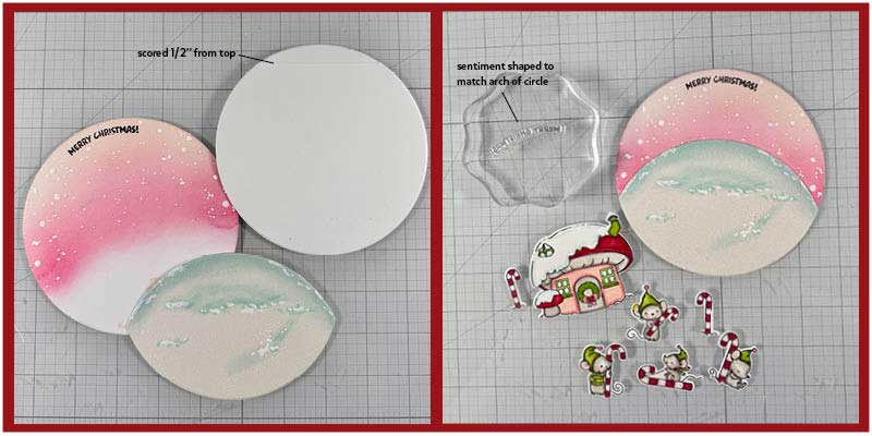 I cut 2-5″ circles from Bristol paper (for easy ink blending and another circle the same size from white cardstock. I cut one Bristol paper circle, forming a hill.