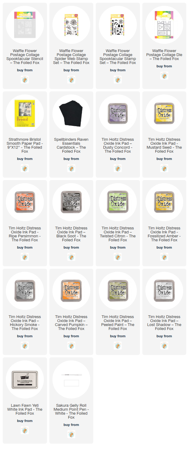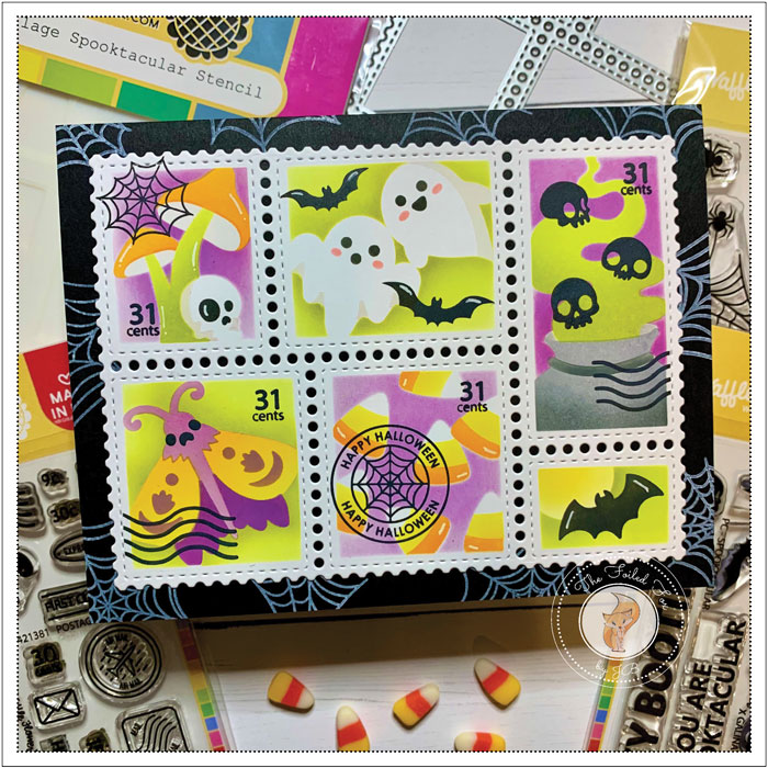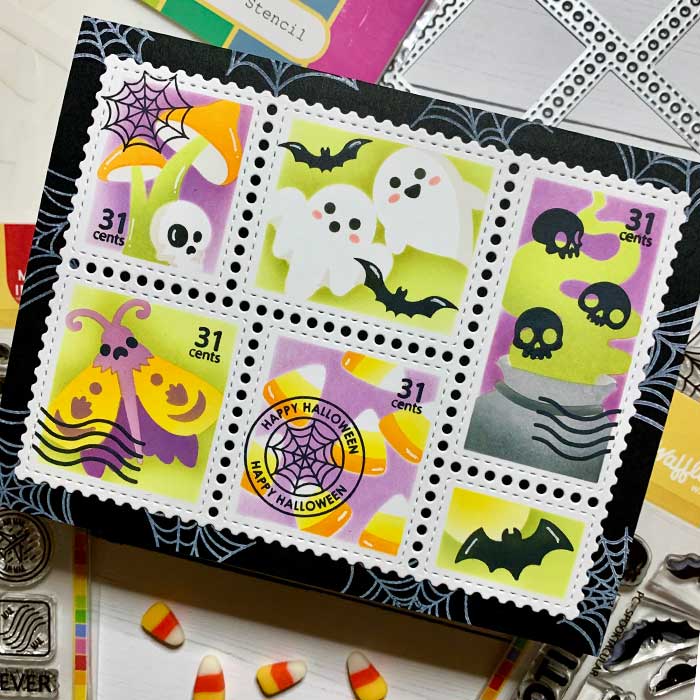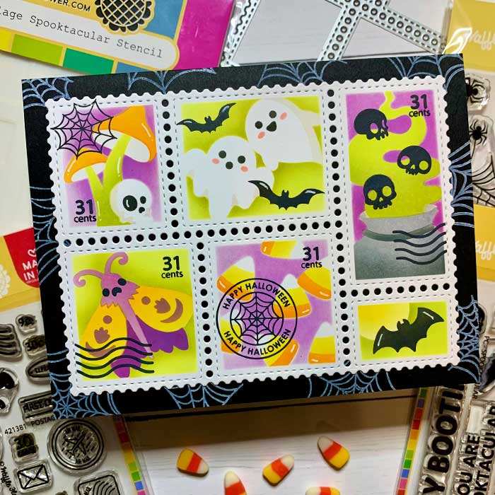 JB (IG @inkblissbyjb) here. Always a pleasure to be here with you all. Today I’m sharing a card using the Postage Collage Spooktacular Stencil, Postage Collage Spectacular Stamps, Postage Collage Spider Web Stamps, and the original Postage Collage Stamps and Postage Die set.