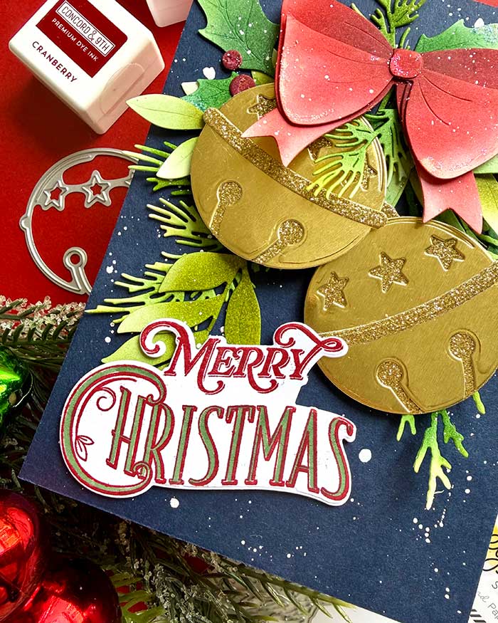 For the sentiment, I used “Merry Christmas” from Papertrey Ink’s Vintage Holiday Flair stamp and die set, stamped it onto white card stock using Cranberry red ink.