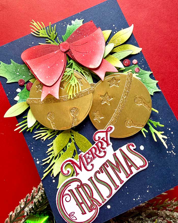Today, I am sharing a classic holiday card complete with a big bow and sleigh bells. The Lovely Layers Sleigh Bells die set by Honey Bee Stamps features delightful sleigh bells and festive foliage, and pairs beautifully with the new Lovely Layers: Bow Bough die set.