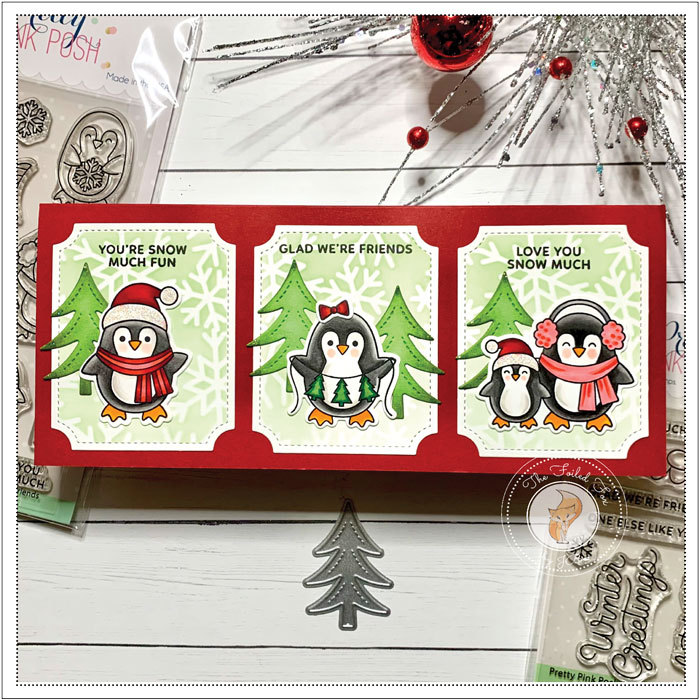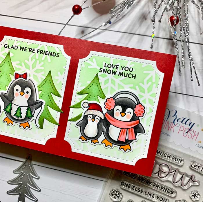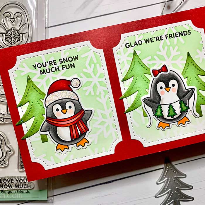 I started by die-cutting three rectangles and masking the edges to ink blend the snowflake stencil with Apple Mint dye ink from Gina K Designs. I then stamped the penguins with Memento Black Tuxedo ink to use with Copic markers.