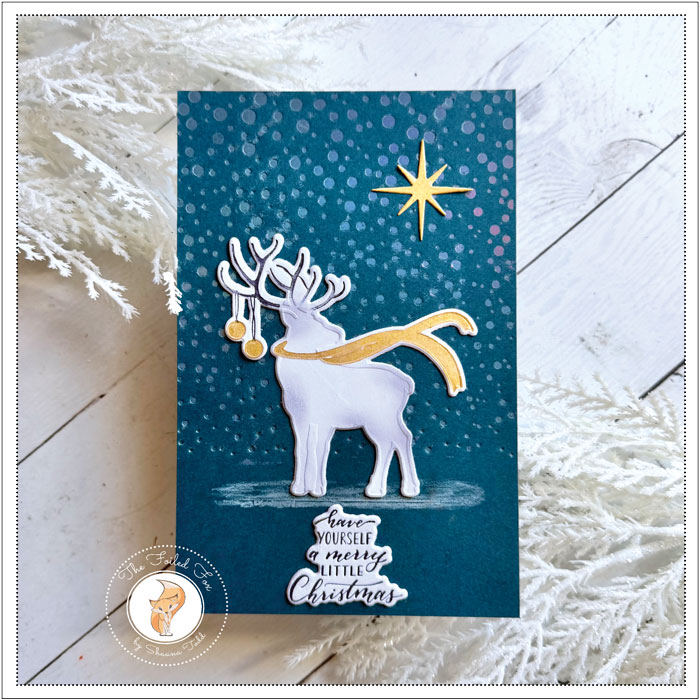 Using a white colored pencil, I made a nice landing place for my reindeer and mounted it, and the sentiment onto my foiled panel. A gold star cut from metallic cardstock, using the Papertrey Ink Starry Delight die set, was added to complete my card design.