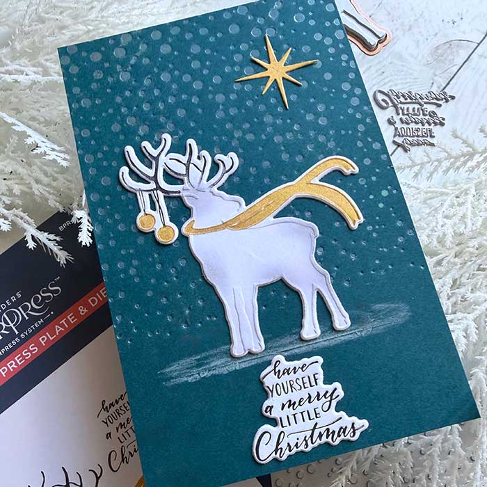 I haven’t used my Betterpress system for a while, and I have missed it! There is nothing like a letterpressed design! I love the deep impressions, especially on Spellbinders cotton papers. It makes all the difference in the world! So, suffice it to say, I used the double-thick cotton paper to letterpress, then cut out the reindeer and sentiment. I used the black letterpress ink for the antlers and gold Delicata Golden Glitz for the scarf and hanging ornaments. Spellbinders have thought of everything by including a template and instructions with the die set to get perfect placement for the gold bits.