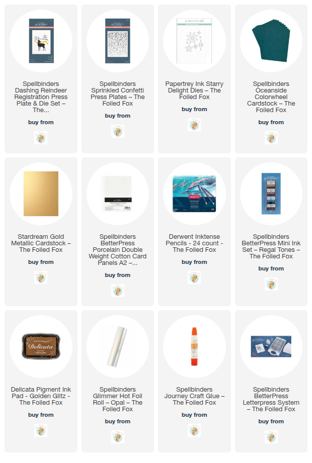 I haven’t used my Betterpress system for a while, and I have missed it! There is nothing like a letterpressed design! I love the deep impressions, especially on Spellbinders cotton papers. It makes all the difference in the world! So, suffice it to say, I used the double-thick cotton paper to letterpress, then cut out the reindeer and sentiment. I used the black letterpress ink for the antlers and gold Delicata Golden Glitz for the scarf and hanging ornaments. Spellbinders have thought of everything by including a template and instructions with the die set to get perfect placement for the gold bits.