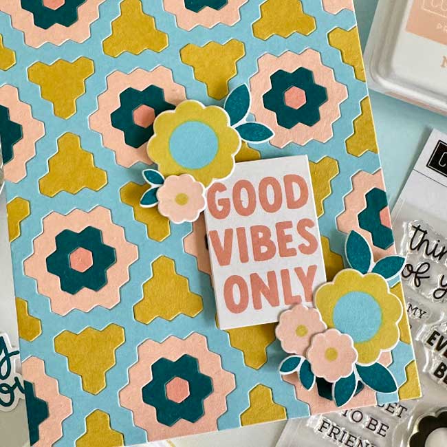 I started my card by using the Hexie Bloom inlay die to create my card panel. I love dies like this! They can be used for so many different occasions, and the color combinations are endless! For my card today I used Concord & 9th cardstock in Nectar, Grapefruit, Honeycomb, Peacock, and Harbor. I can’t wait to use this die again to make a card in Christmas colors!