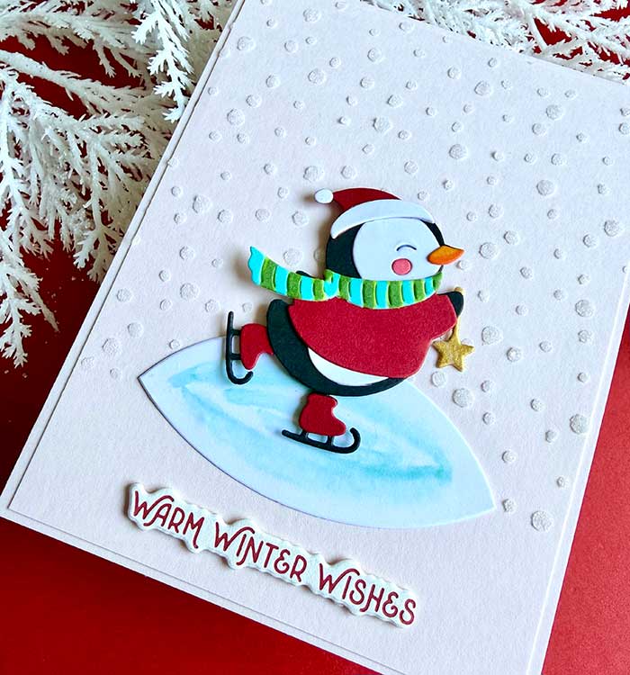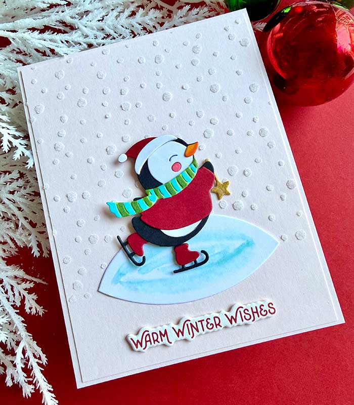 We are jumping into December with a few fast, easy, but very festive card designs. Our design today fits all the criteria! This adorable penguin from the Spellbinders Dancin’ Penguin die set sets the stage for some winter fun!