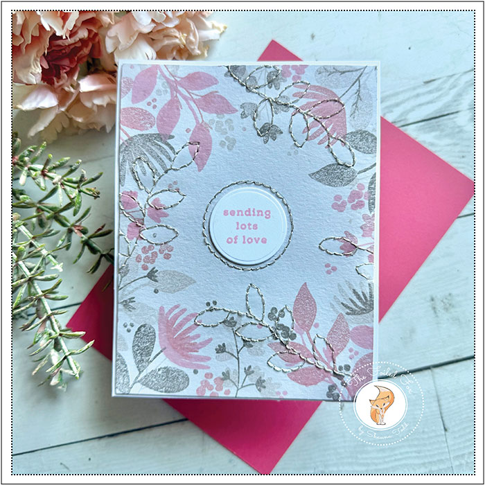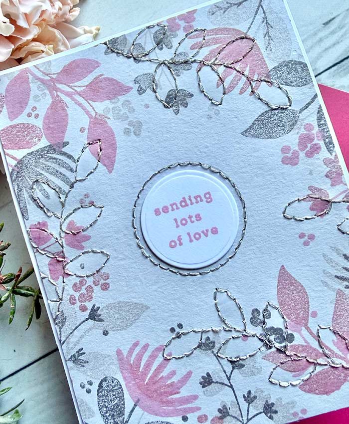 After the panel was completely stitched, I cut a couple of white cardstock circles, then stamped the sentiment using Pink Lemonade, and mounted it.