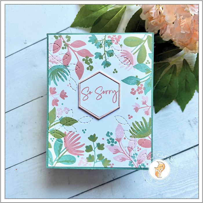 I added a few dotted vines by using the dies in the matching set, then cut a few hexagons from white and Nectar cardstock. One of the white cardstock hexagons was stamped with ‘So Sorry” from the Sympathy stamp set by Penny Black, then stacked with additional hexagons so it would have dimension. At the same time, the hexagon die also cut a thin border. I used the Nectar cardstock borders to surround the hexagon.