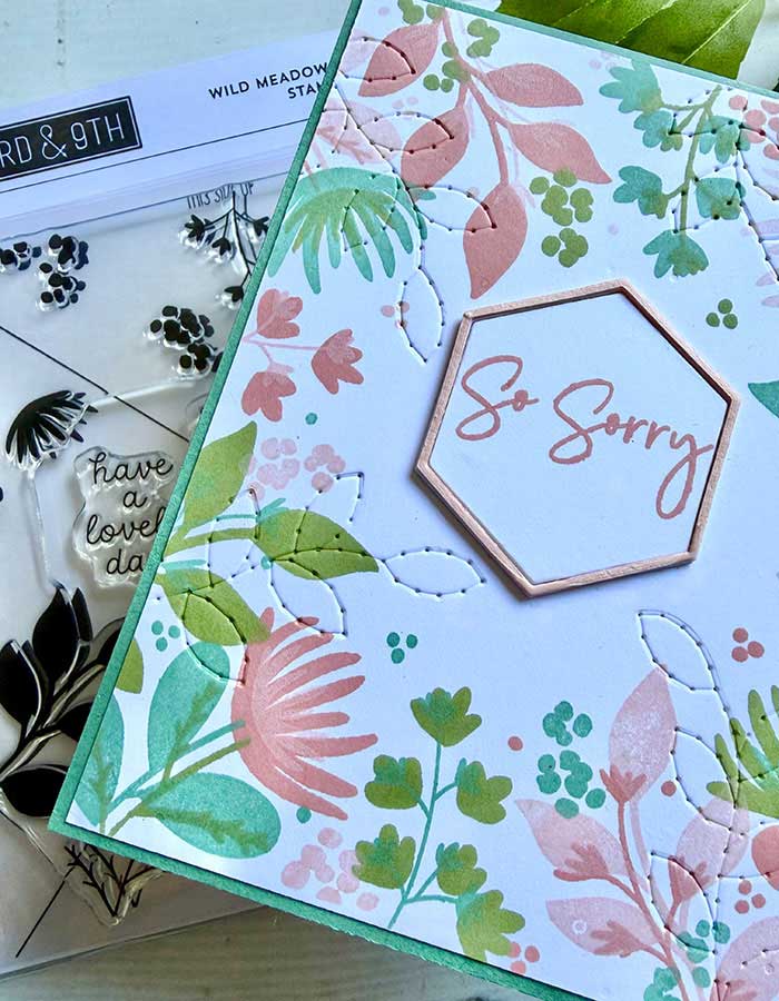 I have two new card designs to share with you today. Each card uses the beautiful Wild Meadow turnabout stamp and its matching die set by Concord & 9th. Turnabouts are a lot of fun when creating awesome backgrounds. You can choose to rotate 1 to 4 times, depending on how populated you want your design. To top it off, there is a matching die set that helps with the sentiments and dies that you can use to create a dotted design or stitch a stunning pattern.