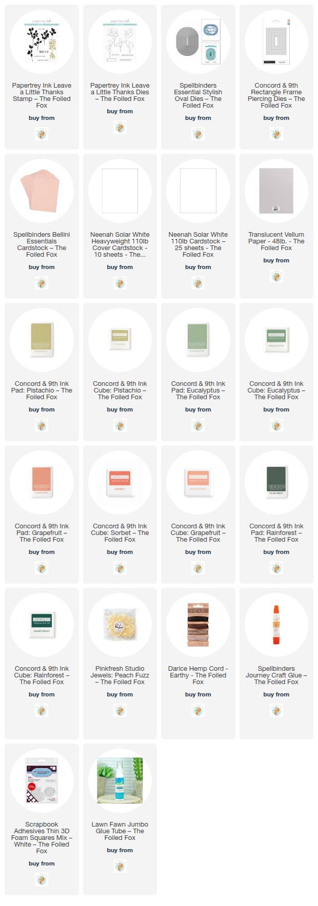 The vellum panel was stamped multiple times using the various leaf stamps in the Leave A Little Thanks set. I used a combination of colors like Concord & 9th’s Grapefruit and Sorbet for the leaves, accented by Eucalyptus and Pistachio. Once the vellum panel was done, I added it to the top of the Bellini panel. Then, holding the two panels together, I embossed a pierced edge using the Concord & 9th Rectangle Frame Piercing die. This combination of panels was added to the front of the Rainforest panel and card base. To finish the foundational part of the card, I cut a white cardstock oval using the Spellbinders Essentials Stylish Oval die set, then added it to the top of the card front.