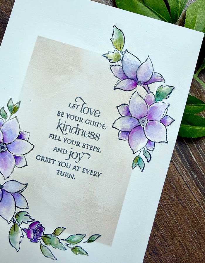 With the watercolor paper and one of the stencils from the Background Basics pack, I centered the stencil and very lightly blended on first Lost Shadow, then a dash of Tattered Rose distress ink to warm the colors. I was careful not to apply too much ink where the floral sprays would go.