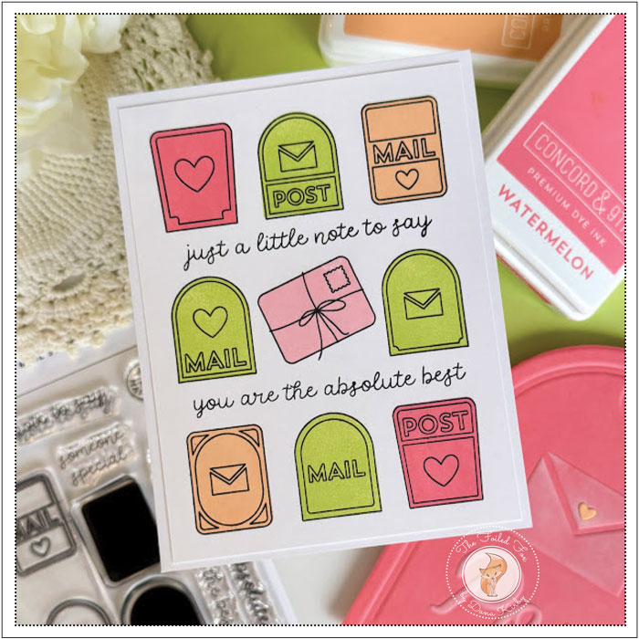 Hi friends! It’s Dana (IG: @dkirbystamps) here today, and I am excited to be back sharing a couple of cards that use the Happy Mail set from Concord & 9th. This set includes a coordinating stamp set, dies, and an embossing folder. It’s perfect for Valentine’s Day, but can be used throughout the year. Who wouldn’t love to receive some Happy Mail?