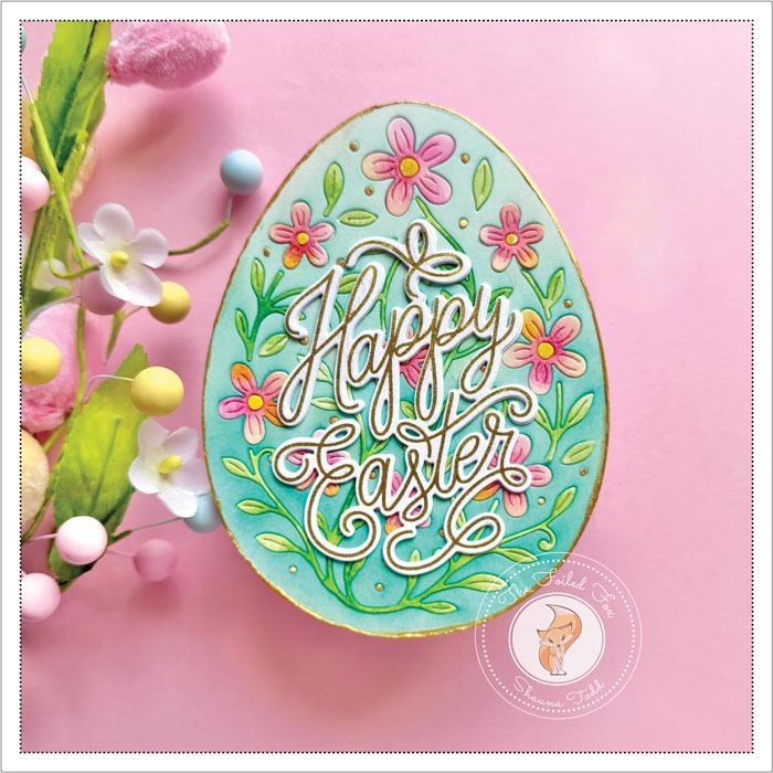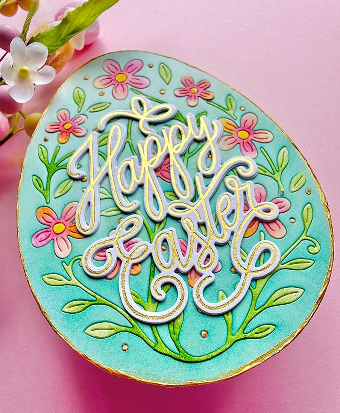With Easter right around the corner, I am sharing a festive Easter-shaped card. I used the In Bloom Egg by Spellbinders, combined with Hero Arts’s Happy Letterpress Foil & Cut set. They are perfect companions!
