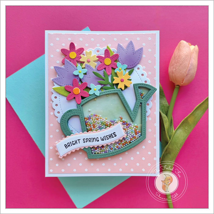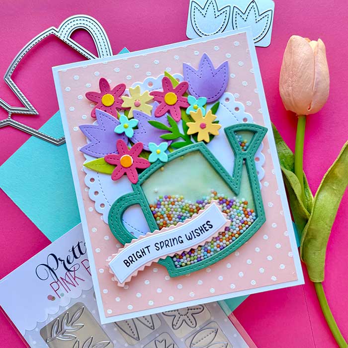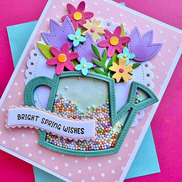The watering can and flowers are the stars of the show, so I started there. Using a variety of Spellbinders cardstock colors, I cut out a bunch of flowers and leaves and assembled the few bits needed. I also cut out a stack of watering can shakers from Eucalyptus carstock so I could stack and glue them together, creating room for the shaker beads. You could use foam tape to pop up the watering can, but by stacking the watering can cutouts, I avoided the beads sticking to all the edges of the tape. With the top watering can cutout, I added an acetate backing to hold the beads in. Then, I added the back full watering can to complete the shaker.