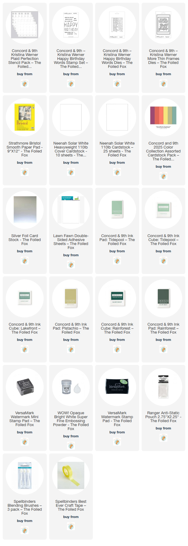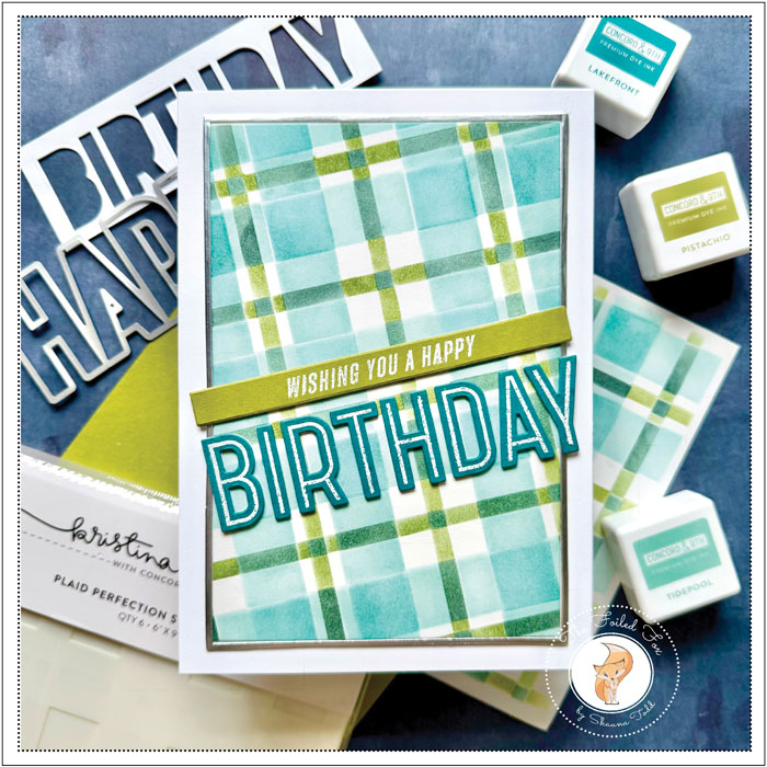 Every once in a while, or in my case, more often than not, I need a card for the men in my life. And it turns out, I have quite a few! This always presents a problem, as I usually prefer to make more feminine cards. However, I have found one sure fix… the Plaid. And there is no better plaid maker than Kristina Werner’s (with Concord & 9th) Plaid Perfection. This fabulous stencil set creates any plaid color combination your little heart desires! Then, I coupled the stencil set with one of my favorite birthday stamp and die sets, Birthday Words by Kristina Werner.