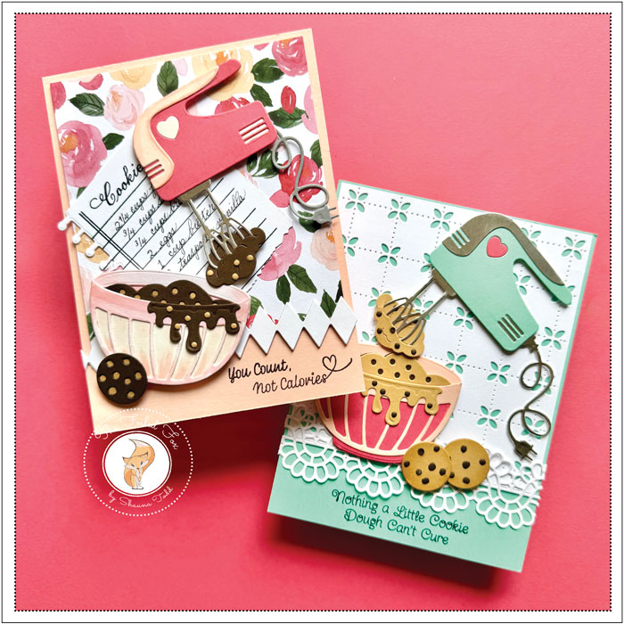 The Spellbinders Colorwheel cardstock colors used for the mixer, bowl, and cookies, plus dough were Waterfall, TuTu, Bellini, Silver foil, Fawn, and Truffle (a complete supply is below).