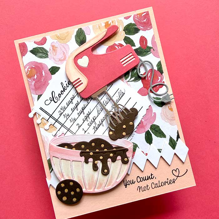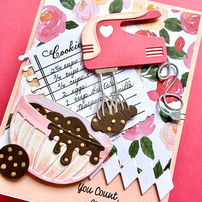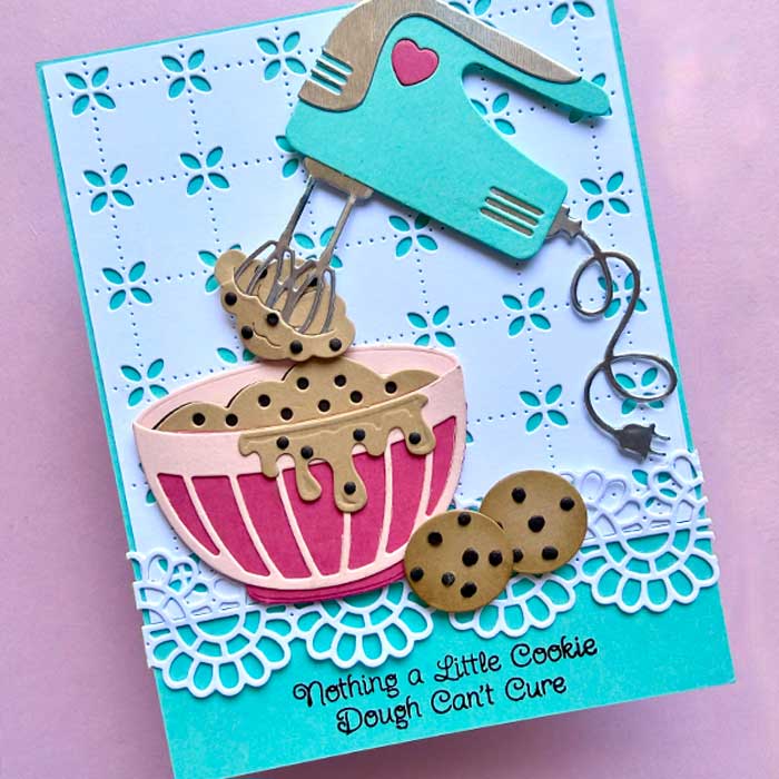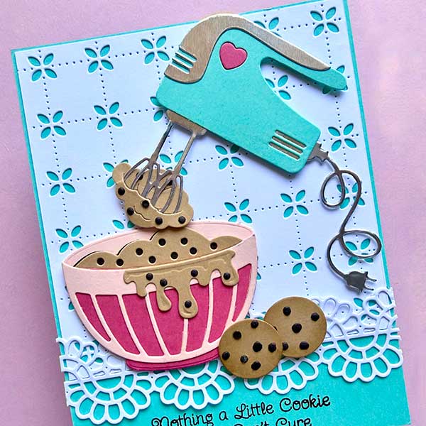 I am totally smitten with Spellbinders new Make It and Bake It die sets. I especially love the Magic Mixer one. It features a retro mixer with a classic mixing bowl … both are adorable!