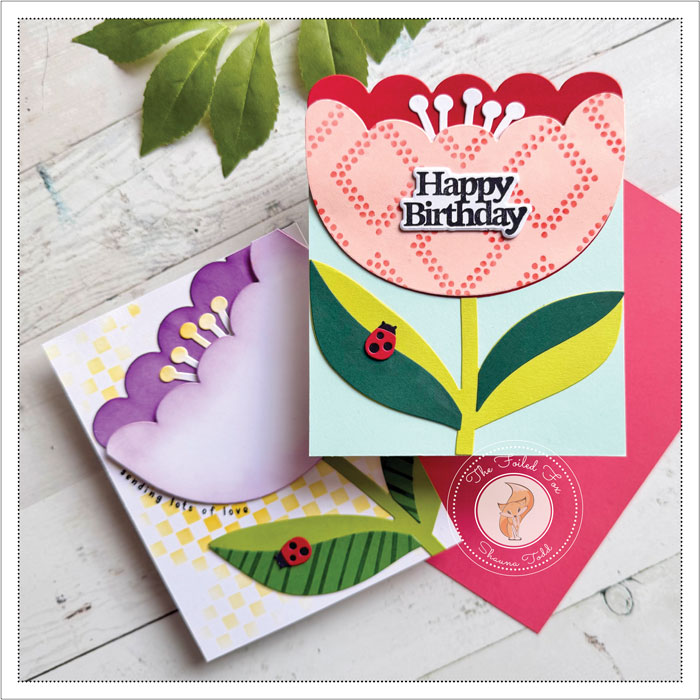 Finally, I have had a chance to use the delightful Scalloped Petals stamp and die set by Concord & 9th. I love the big, bold flower with the sweet little ladybug! You can choose any color scheme you like, and it will change the flavor of your card designs. I have made two so you can see what I mean. These cards were an easy make and so fun!