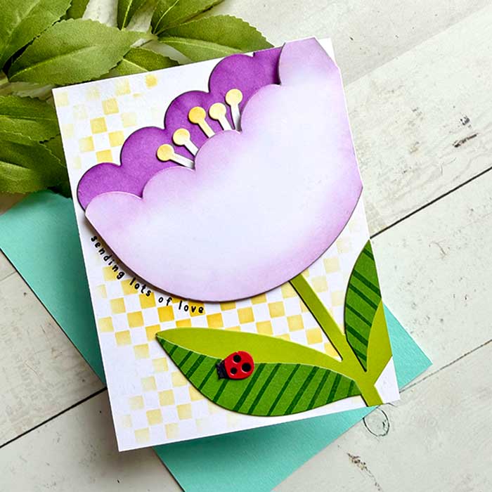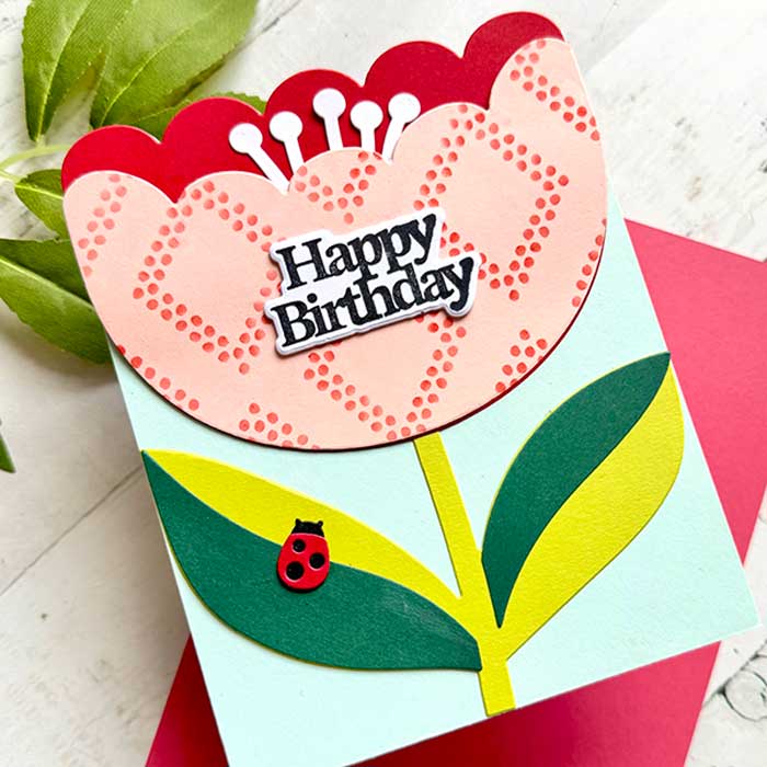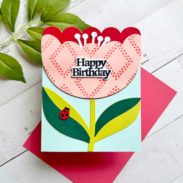 The stamen was cut from white cardstock, and the leaves were cut from Juicy Pear and Rainforest. Finally, the ladybug was cut from Raven black and Poppy Red cardstock.