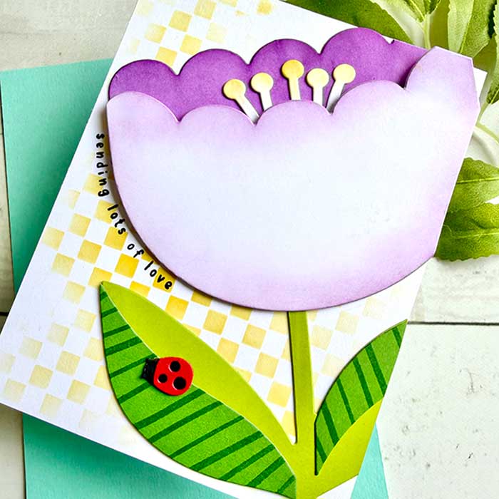 The flower and leaves were mounted at an angle, and the edges trimmed. A cute curved sentiment was stamped alongside the flower, and another ladybug was set onto the leaf.