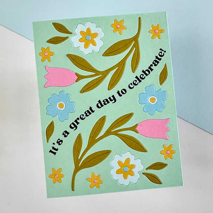 I started my card by creating my card panel with the Petal Path Inlay die and Concord & 9th cardstock. I used Sea Glass, Carnation, Powder, Habor, Grasshopper, and Honeycomb cardstock for all of my die cutting. Once the pieces were die cut, I inlaid them back into the Sea Glass card panel using a strong liquid glue to hold everything in place. I love all the color combinations and unique designs you can create with this die. You will love it!