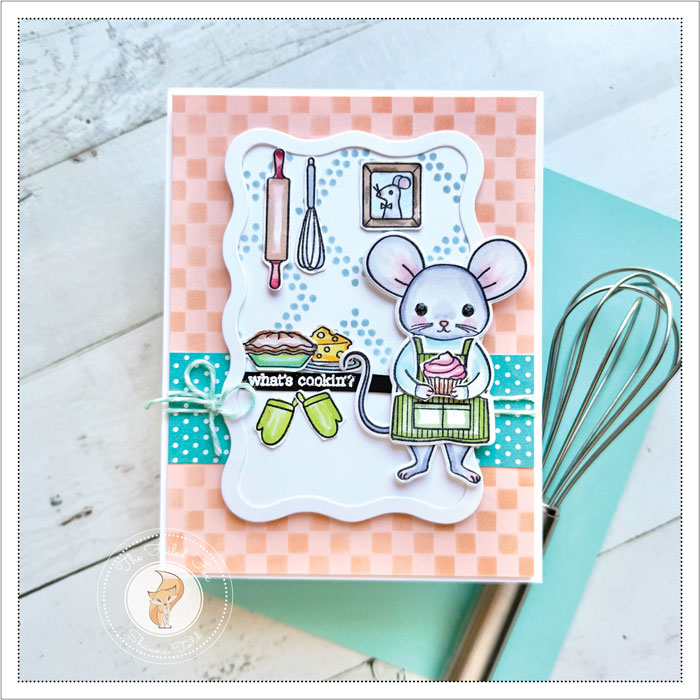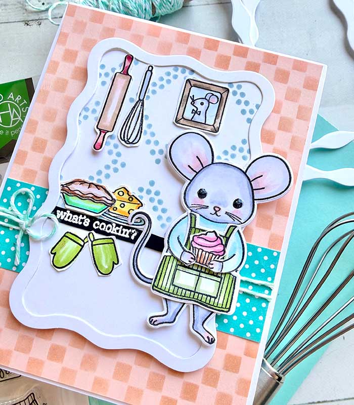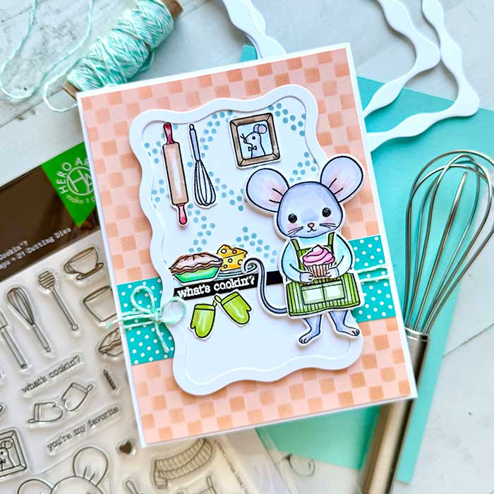 I am jumping in this Saturday with a fun card design. This one features the cutest mouse! She is from the What’s Cookin’ stamp and cut set by Hero Arts. There are lots of accessories you can get for the mouse, like different outfits and super fun accoutrements. But today she is in the kitchen, whipping up some goodies!