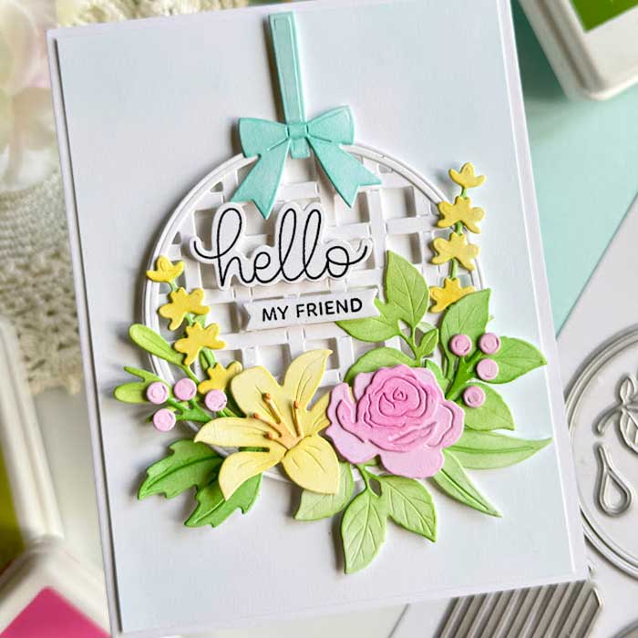 It’s Dana here today and I am sharing a card that uses the Into the Blooms: Spring Basket dies from Papertrey Ink. I love this basket-weave hoop frame. It makes the perfect backdrop for all the gorgeous florals and foliage included in this set.