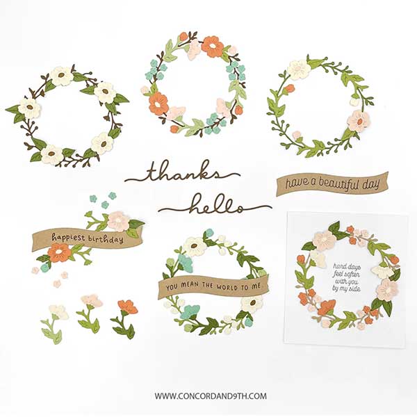 Briar & Blooms dies by Concord and 9th. Create lovely, layered wreaths with ease using the Briar & Blooms Dies! Cut out the base of the wreath and use it as a guide to add your blooms and greenery in any number of C9 palettes. Finish off your creation with a scripty die-cut sentiment or one of the many charming greetings from the coordinating Briar & Blooms Stamp Set (see below). 3″ x 4″. 14 pieces.