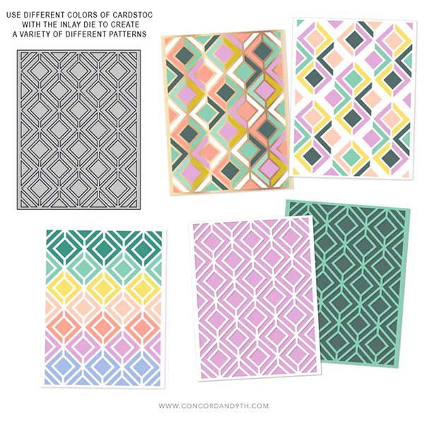 Diamond Lattice Inlay die by Concord and 9th. Piece together eye-catching backgrounds with a polished feel when you create with the Diamond Lattice Inlay Die! Its clean lines and bold design make it easy to mix and match colors for any project or occasion. We love a good geometric pattern, and this one is a total gem! 1 die.