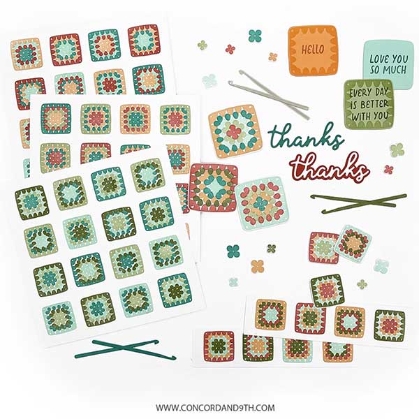 Granny Square Turnabout stamp set by Concord and 9th. Bring the warmth and comfort of a handmade blanket to your cards with the Granny Square Turnabout™ Stamp Set. Get that gorgeous, detailed crochet look without ever picking up a needle! Simply pick out four colors of ink and in four turns of your paper you’ll have a background full of granny squares! Turn it into a card front or use the coordinating dies to cut out the stamped images and rearrange them any which way. In addition to the Turnabout, this set comes with stamps to create larger individual granny squares and a bunch of sweet sentiments giving you so many cozy options. 6″ x 8″. 14 stamps.