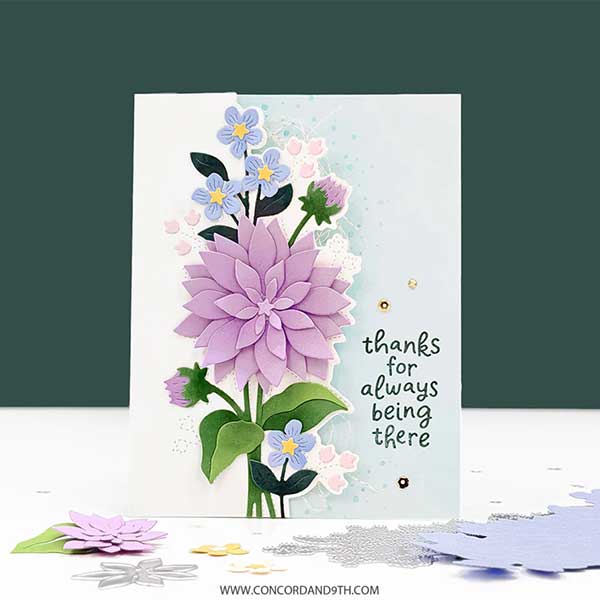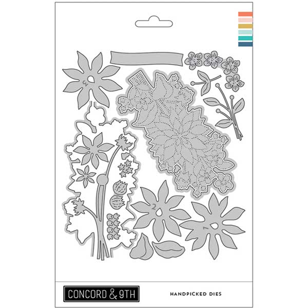 Handpicked dies by Concord and 9th. Create cards filled with big, beautiful flowers with the Handpicked Dies! The large stitched pattern acts as a guide so you can easily layer die-cut blooms on your card or use it as a simple background design. Cut the design directly into a card front, run it through your machine with the outline die, or cut along the edge of the design to create a shaped card. The larger petal dies are numbered and have little teardrops on themto take the guesswork out of piecing the die-cut flowers together. Coordinates with the Handpicked Stamp Set (see below). 19 pieces.