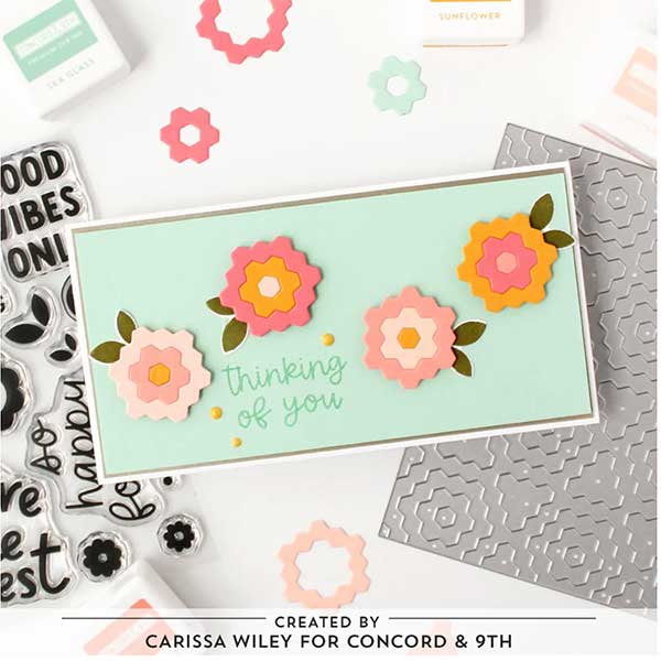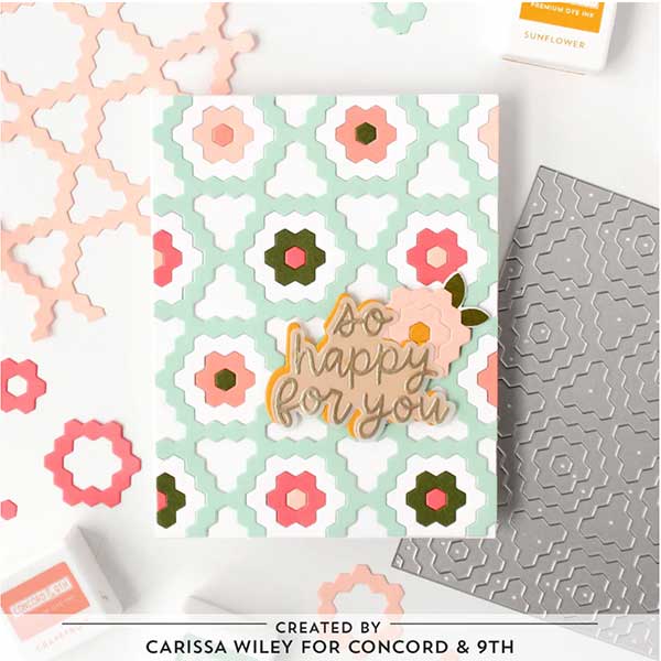 Hexie Bloom Inlay Die by Concord and 9th. The Hexie Bloom Inlay Die creates a geometric floral pattern that’s perfect for card fronts, backgrounds, and more. Each pass through your machine creates a full panel of hexie flowers ready to be mixed, matched and pieced together in combinations of soft pastels, bold brights and everything in between.