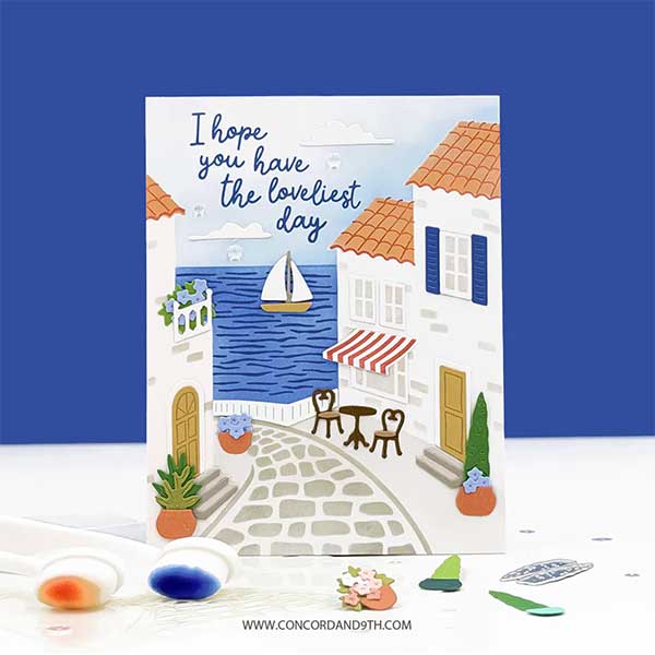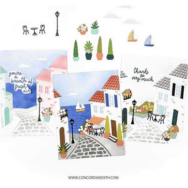 Seaside Stencil Pack by Concord & 9th. Layer together the soft skies, ocean blues and charming cobblestone streets with the Seaside Stencil Pack, then bring the dreamy coastal scenes to life with the coordinating Seaside Dies and Seaside Stamp Set. Four 4.75″ x 6″ stencils.