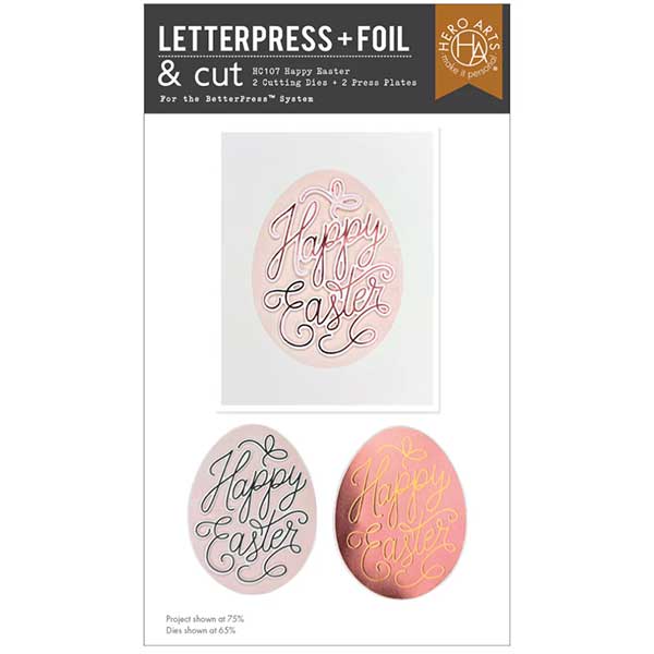 Happy Easter Letterpress and Foil and Cut by Hero Arts. Add an elegant finishing touch to your Easter cards with the Happy Easter Letterpress + Foil & Cut Set. Designed for the BetterPress and Glimmer Systems, this set includes two press plates and two coordinating cutting dies that create a beautifully detailed egg-shaped greeting with graceful script lettering.