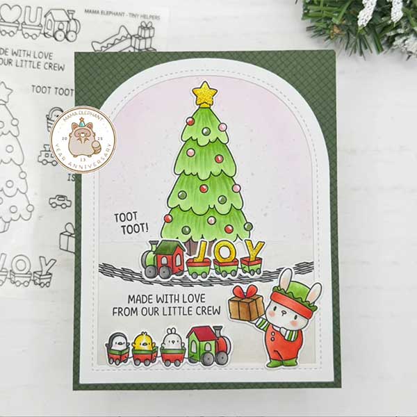 Tiny Helpers stamp set by Mama Elephant. Tiny Helpers clear stamp set features Mama Elephant’s friends taking on the role of Holiday elves, joyfully pitching in for the festivities. From decorating the tree to delivering gifts, these playful helpers capture the magic of the season. To make the scene even sweeter, the set includes the cutest toy choo choo train, filled with Mama Elephant’s tiniest critters, ready to spread holiday cheer.