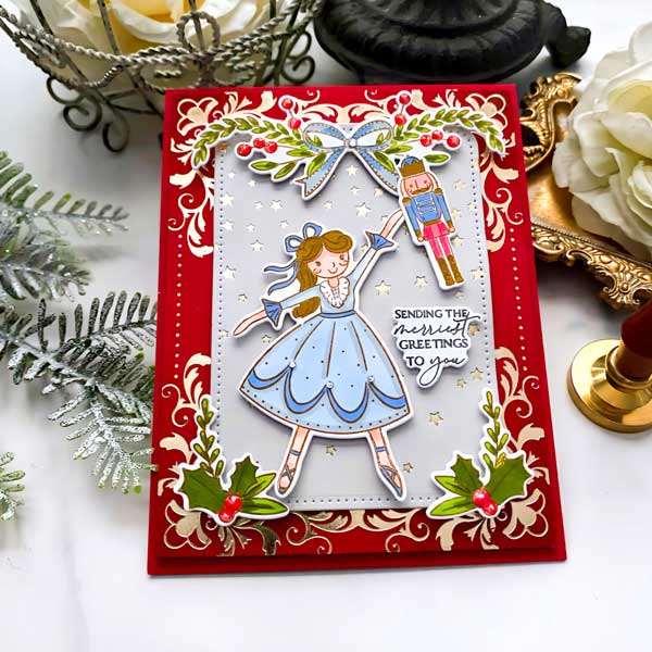 This set comes on two 4″ x 6″ acetate sheets. Clara is just under 2 1/4″ wide and just under 3 1/8” tall. The Sugar Plum Fairy is just under 2 1/2” wide and just under 3 5/8” tall. The Mouse King is just over 1 1/4” wide and just over 3 1/8” tall. The mini nutcracker is just under 1/2” wide and just under 1 5/8” tall. The nutcracker with beard is just over 1” wide and just under 3 3/8” tall. The nutcracker with the crown is just under 1” wide and just over 3 1/4″ tall. The decorative greenery vary in size from the smallest being just under 1 1/8” wide and just under 1 1/4” tall and the largest being 3 1/2″ wide and just over 1 1/8” tall. The stars vary in size from the smallest being just under 1/4” wide and just under 3/8” tall and the largest being just under 1 1/8” wide and tall. The “Wishing You An Enchanting Holiday Season Filled…” is just under 1 3/8” wide and just over 7/8” tall. The “Let The Magic Of The Season Begin” sentiment is just over 1 3/4” wide and just over 5/8” tall. The “Sending The Merriest Greetings To You” sentiment is just over 7/8” wide and just over 3/4” tall.