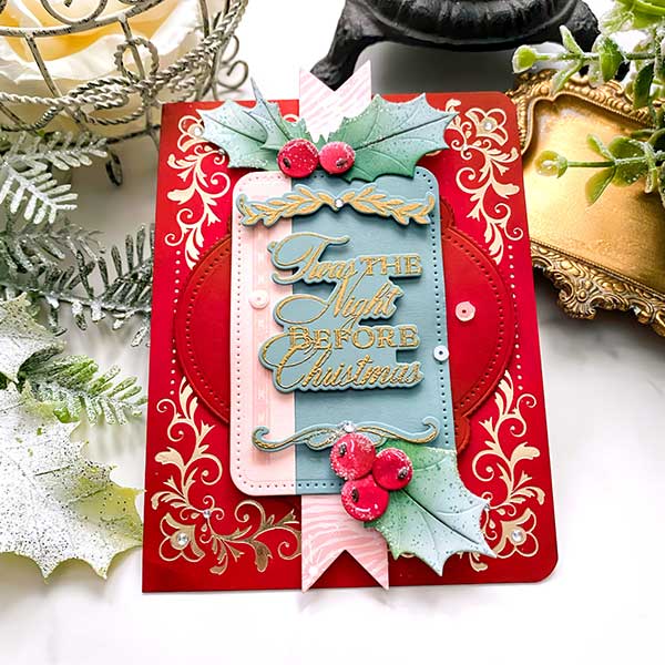 This set comes on a single 3″ x 4″ acetate sheet. The ‘Twas the Night Before Christmas poem snippet is 2 1/2″ wide and just under 2 3/8” tall. The decorative flourishes vary in size from the smallest being just over 1 5/8” wide and just under 1/8” tall and the largest being just over 2 1/8” wide and just under 1/2” tall. The trio of berries is just over 1/8” wide and tall.