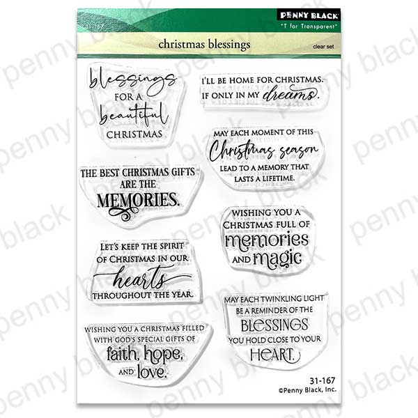Christmas Blessings clear stamp set by Penny Black. This is a beautiful sentiment stamp set with 8 heartfelt Christmas or holdiay sentiments.