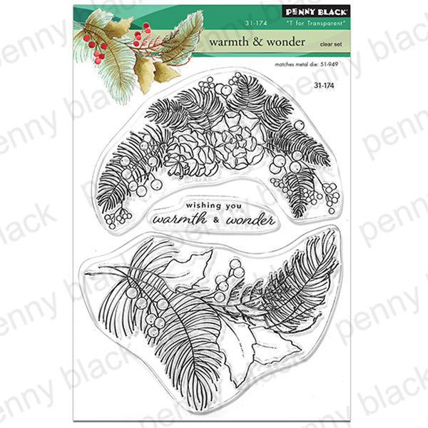 Warmth & Wonder stamp set by Penny Black.  This 3 piece clear stamp set features pine branches, holly, berries and a sentiments.