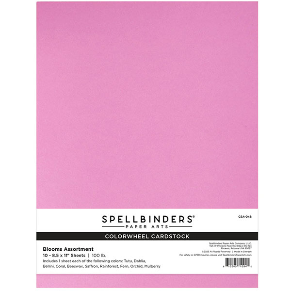 Blooms Colorwheel cardstock assortment (8 12/” x 11″ – 10 sheets) by Spellbinders. Blooms ColorWheel Cardstock Assortment is a pack of 10 sheets of cardstock 100 lb or 270 gsm in thickness. The cardstock is smooth on both sides and has a solid color core. Every creation starts with a great foundation of high-quality cardstock, so be sure to add this pack to your supplies! Enjoy creating with hues of this flower inspired pack that contains one sheet each of: