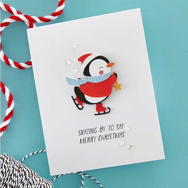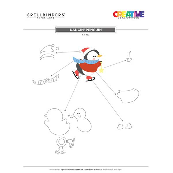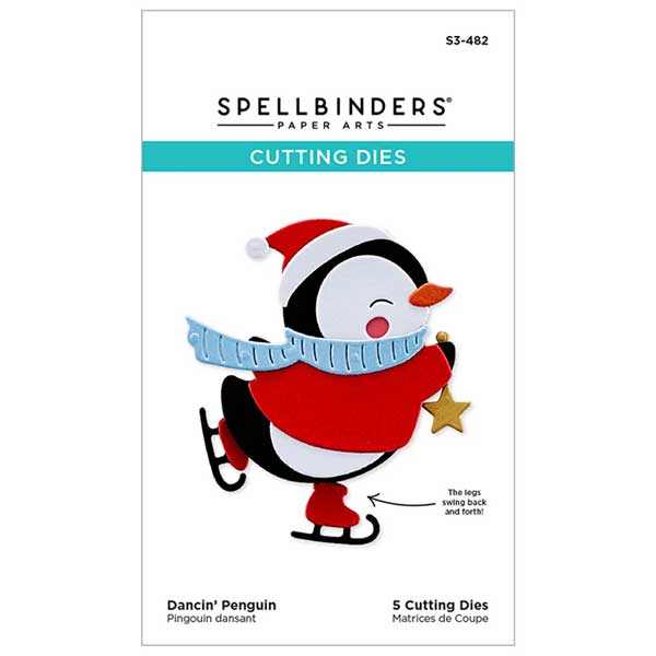 Dancin’ Penguin etched dies by Spellinders. Dancin’ Penguin Etched Dies is part of the Dancin’ Christmas Collection with a set of five thin metal cutting dies to assemble this adorable penguin. Watch him skating as his legs move back and forth – LOVE! The assembled Penguin measures 2.25 x 2.00 in./5.72 x 5.08 cm.