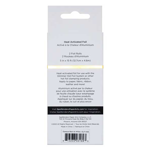 Glimmer Hot Foil 2 Rolls – Opaque Black & White Pack by Spellbinders. It comes in a new 2-pack box format. Each roll is 15 feet with a width of 5 inches. Colors include Opaque Black and White.