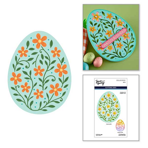 In Bloom Egg etched dies by Spellbinders and Simon Hurley. In Bloom Egg Etched Dies are from the Happy Spring Collection by Simon Hurley. Assembled, this set of two thin metal cutting die makes a stunning decorated egg motif. Nest both dies together to cut a floral-filled egg, or use the outline die to make a solid egg shape. The finished In Bloom Egg measures approximately 4.12 x 5.39 in./10.50 x 13.70 cm.