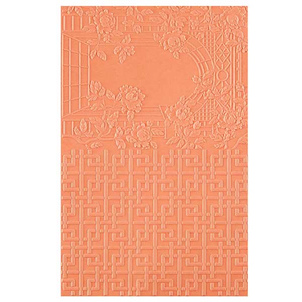 Regal Lattice 3D embossing folder by Spellbinders. Regal Lattice 3D Embossing Folder offers twice the design possibilities in one single folder! The top half of the folder features an elegant bamboo arch covered with vines and leaves, while the bottom half is an all-over lattice design. Each half of the folder embosses an A2 size card panel, making it easy to create two cards at once.