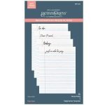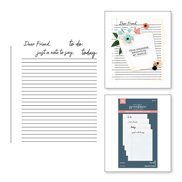 Take Note Registration BetterPress Plates by Spellbinders are from the Take Note Collection. The set of six press plates and mylar printed registration template come together to help you create a classic notebook page design. There are four sentiments to personalize: Dear Friend, Just a Note to Say, To Do and Today. What a fun way to capture memories for journaling, or for a unique background on a card!